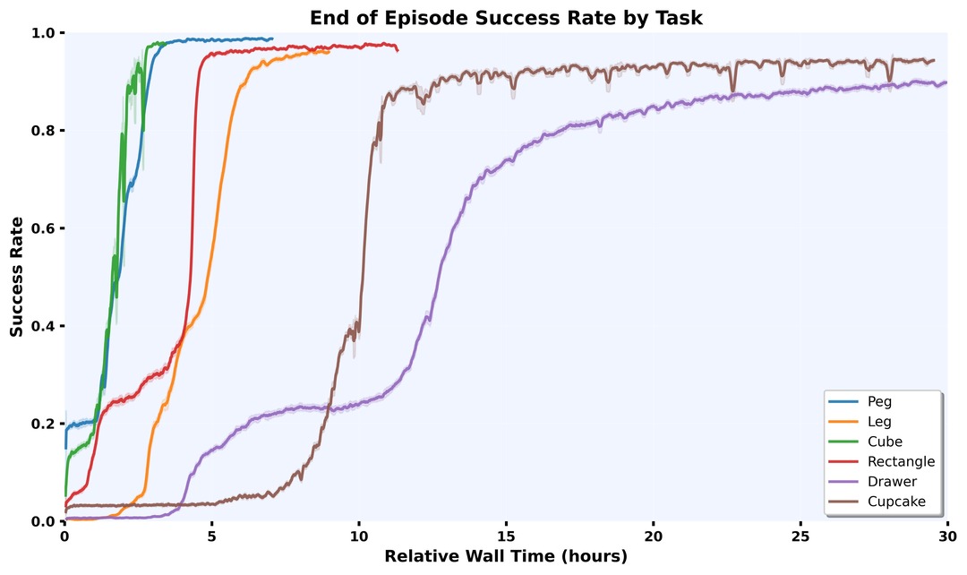 Below are success rate curves for each task plotting over number of training iterations and wall clock time when training on 4xL40S GPUs. Insertion, twisting, cube stacking, and rectangle orientation on wall tasks converge within 8 hours, while drawer assembly and cupcake on plate tasks take 1 day.